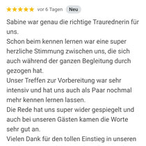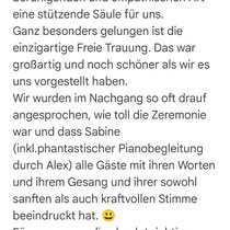 Jede Zeremonie gestalte ich so, wie ihr seid: individuell und einzigartig - mal intensiv und berührend, feierlich und festlich, mal fröhlich, lebendig und voller Schwung – immer so, wie es sich für euch und eure Hochzeitsgäste gut und richtig anfühlt. So wird aus eurem "Ja, ich will" der Start in einen unvergesslichen, traumhaft schönen Hochzeitstag.