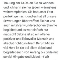 Hallo, ich bin Sabine – seit 2012 Rednerin und Sängerin aus dem Raum Erlangen-Forchheim. Ich begleite eure Liebe – egal, wo und wie ihr sie feiert.
